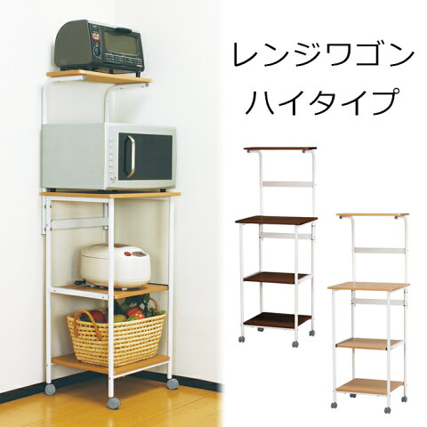レンジワゴン ハイタイプ KW-500 <収納 キッチンカウンター 台所収納 小物 レンジ レンジ台 ラック ホワイト ブラウン キッチン 棚 スリム 炊飯器 デッドスペース シェルフ オーブントースター キャスター付き スライド棚>